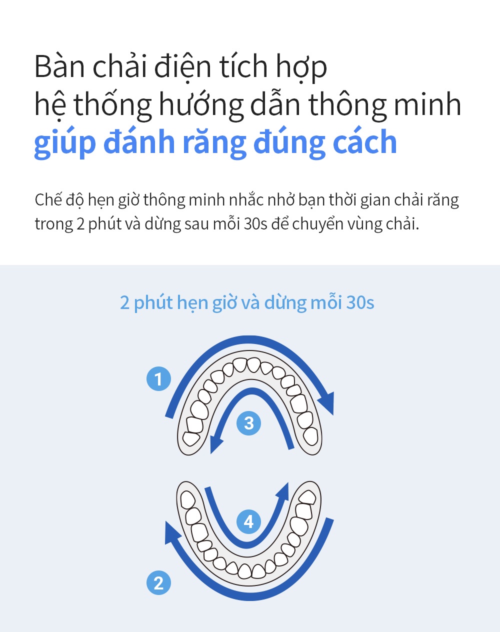 - 2 phút hẹn giờ và dừng mỗi 30s: Chế độ hẹn giờ thông minh nhắc nhở bạn thời gian chải răng trong 2 phút và dừng sau mỗi 30s để chuyển vùng chải.