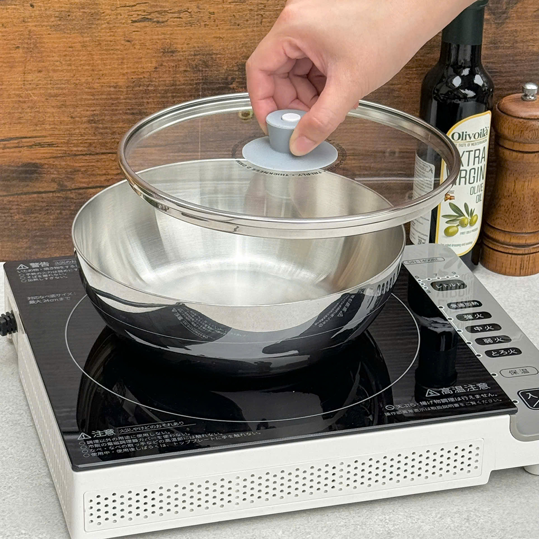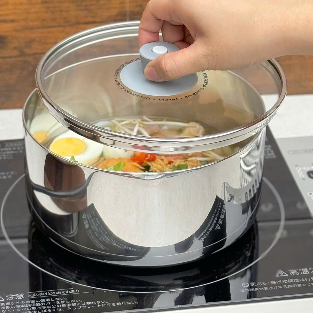 ✔️ Làm nồi đun trên các loại bếp, có nắp kính chịu nhiệt kèm 1 núm nồi silicone di động (hút chặt làm núm nồi khi đun nấu, dễ dàng tháo ra khi dùng các chức năng khác).