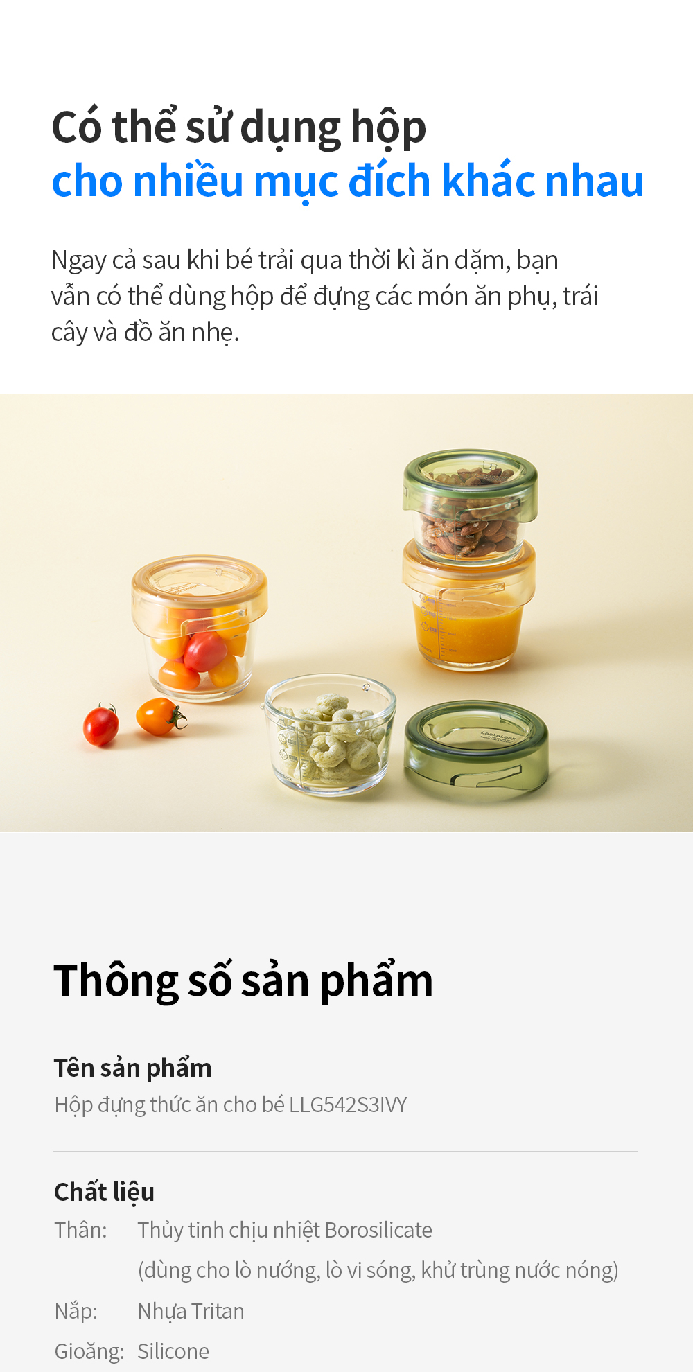 - Hộp dùng đựng đồ ăn cho bé, có thể dùng hộp để đựng thức ăn mang theo khi đi học, đi làm, du lịch... hoặc bảo quản thực phẩm trong tủ lạnh mà không lo tủ lạnh bị ám mùi khó chịu.