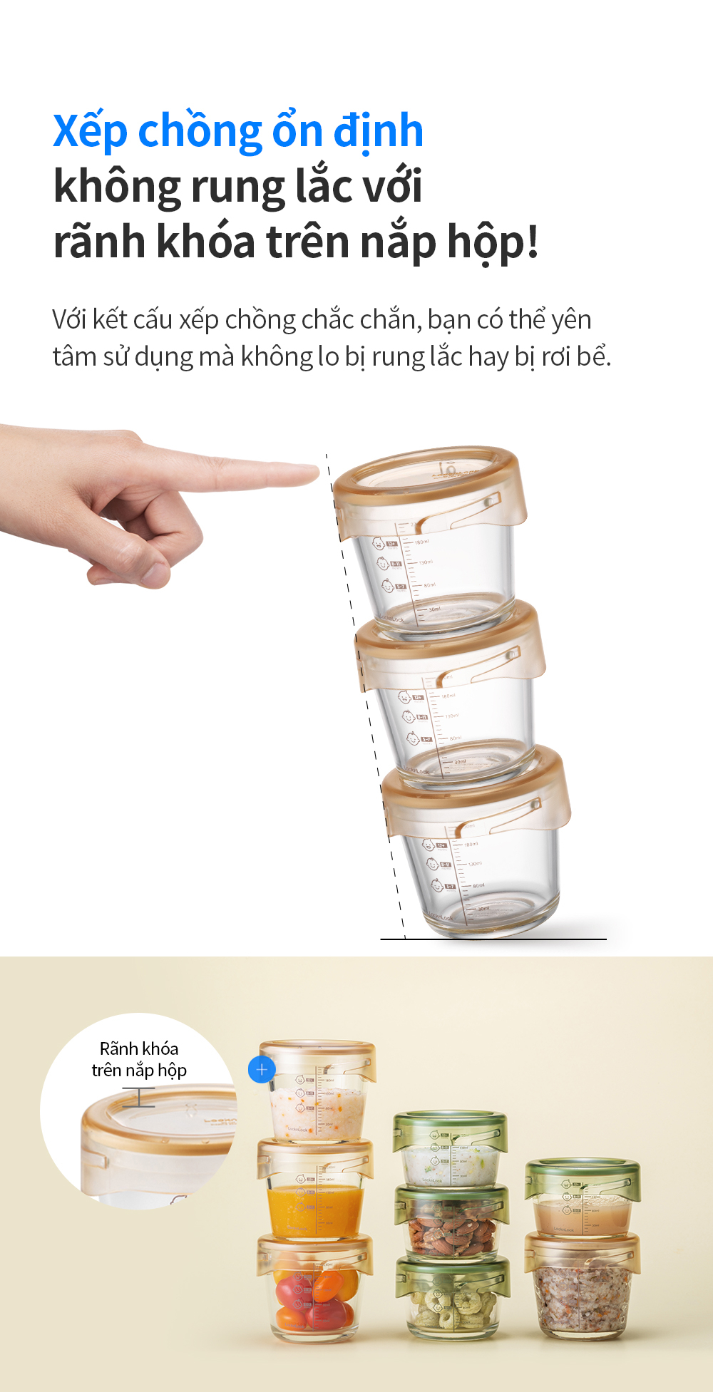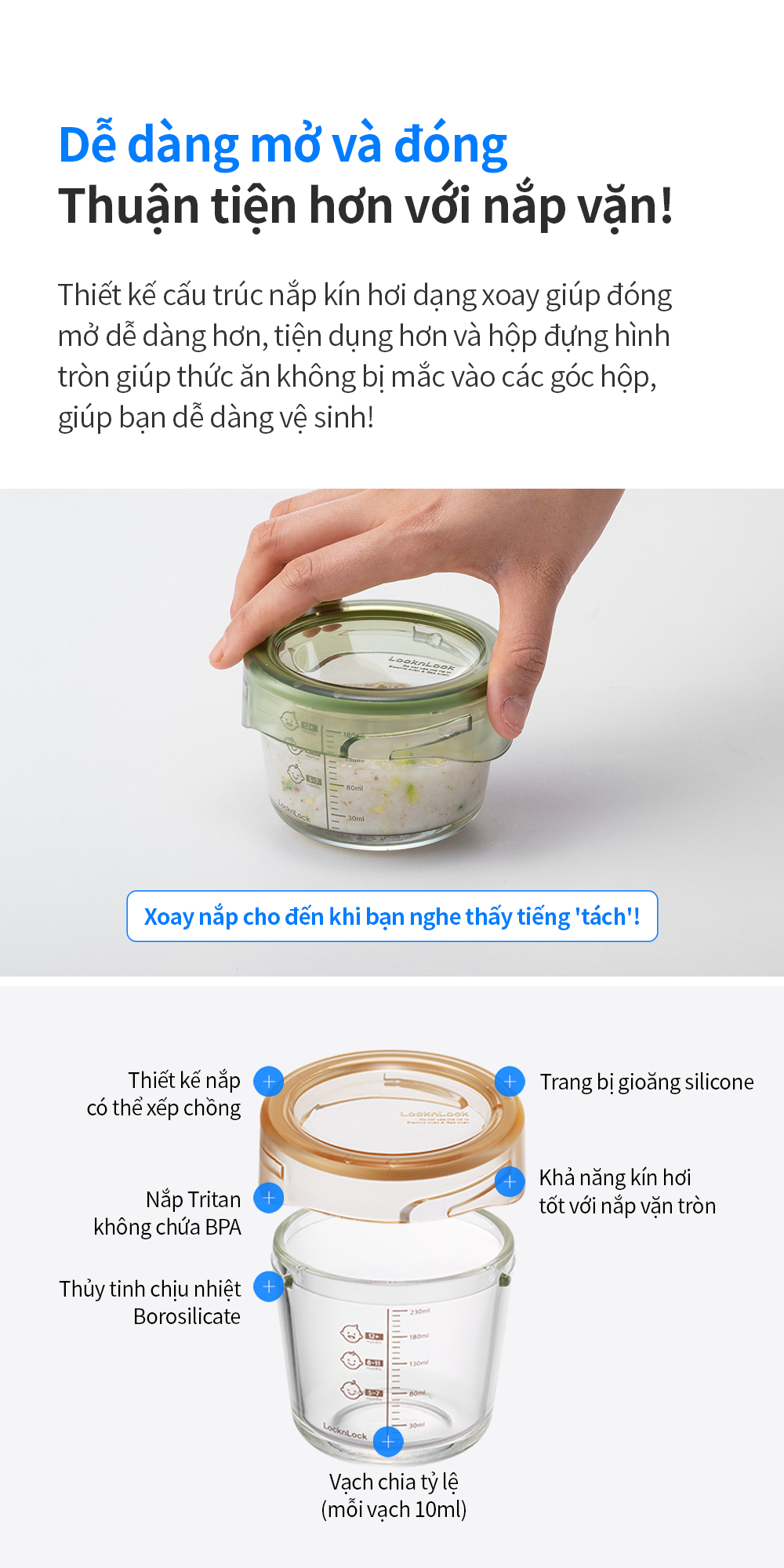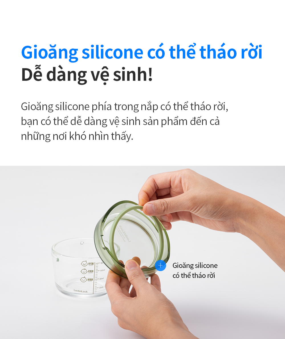 - Thiết kế hộp tròn nắp vặn bằng nhựa tritan chắc chắn. Nắp có zoăng silicone bảo đậy kín hơi, giúp đựng được thức ăn dạng lỏng không tràn đổ và ngăn ngừa bụi bẩn, vi khuẩn xâm nhập hiệu quả.