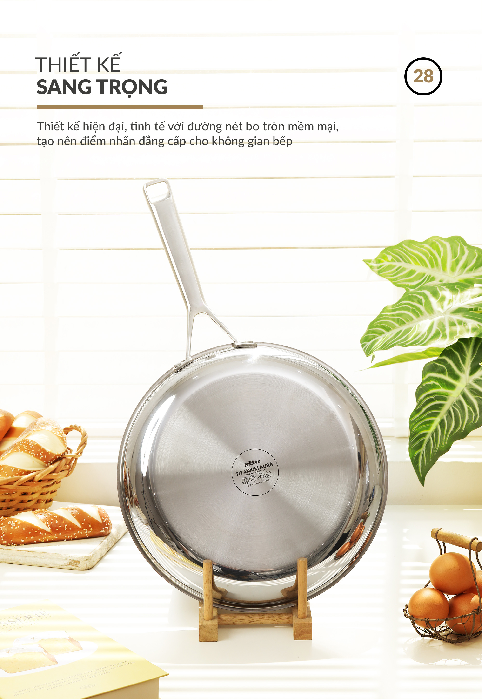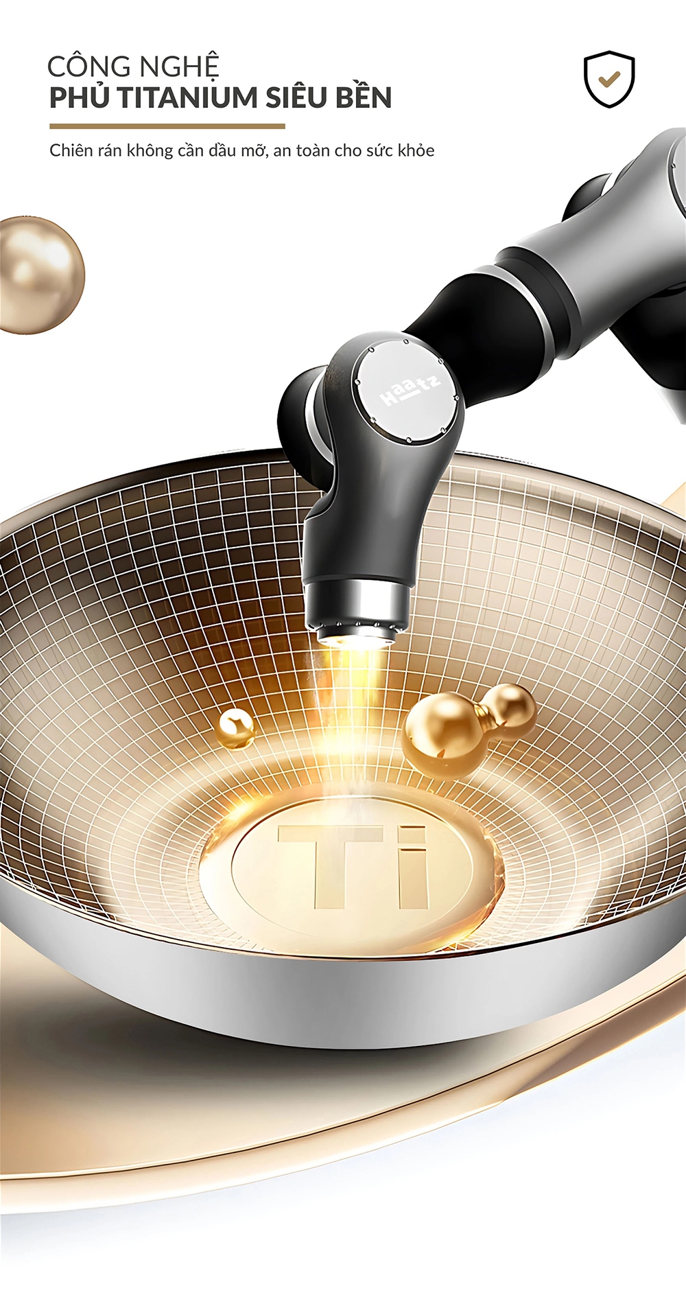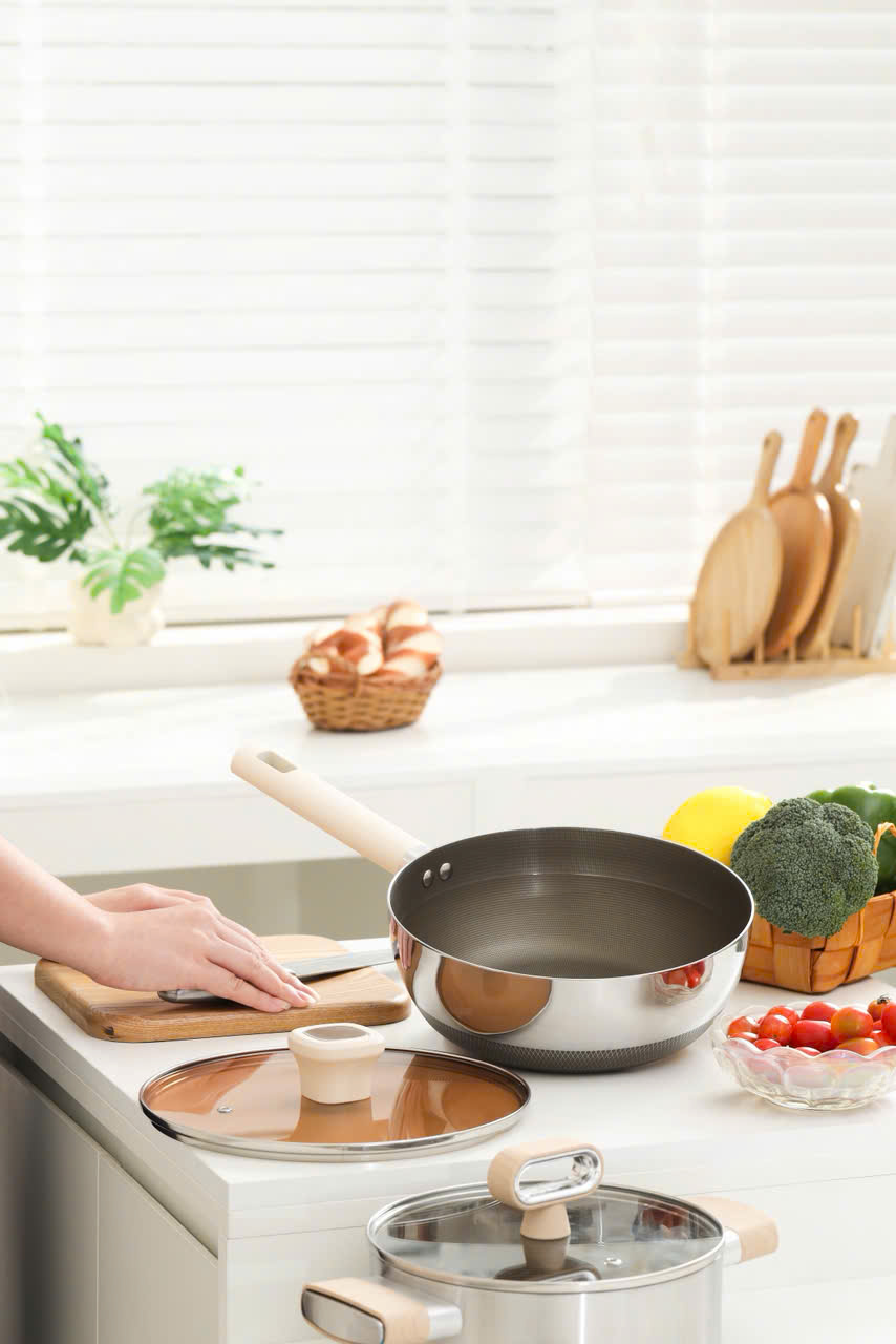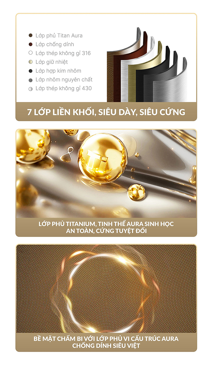 - Lớp phủ Titanium Aura sinh học: Chống dính bền vững, không bong tróc, giảm 50% dầu mỡ khi nấu