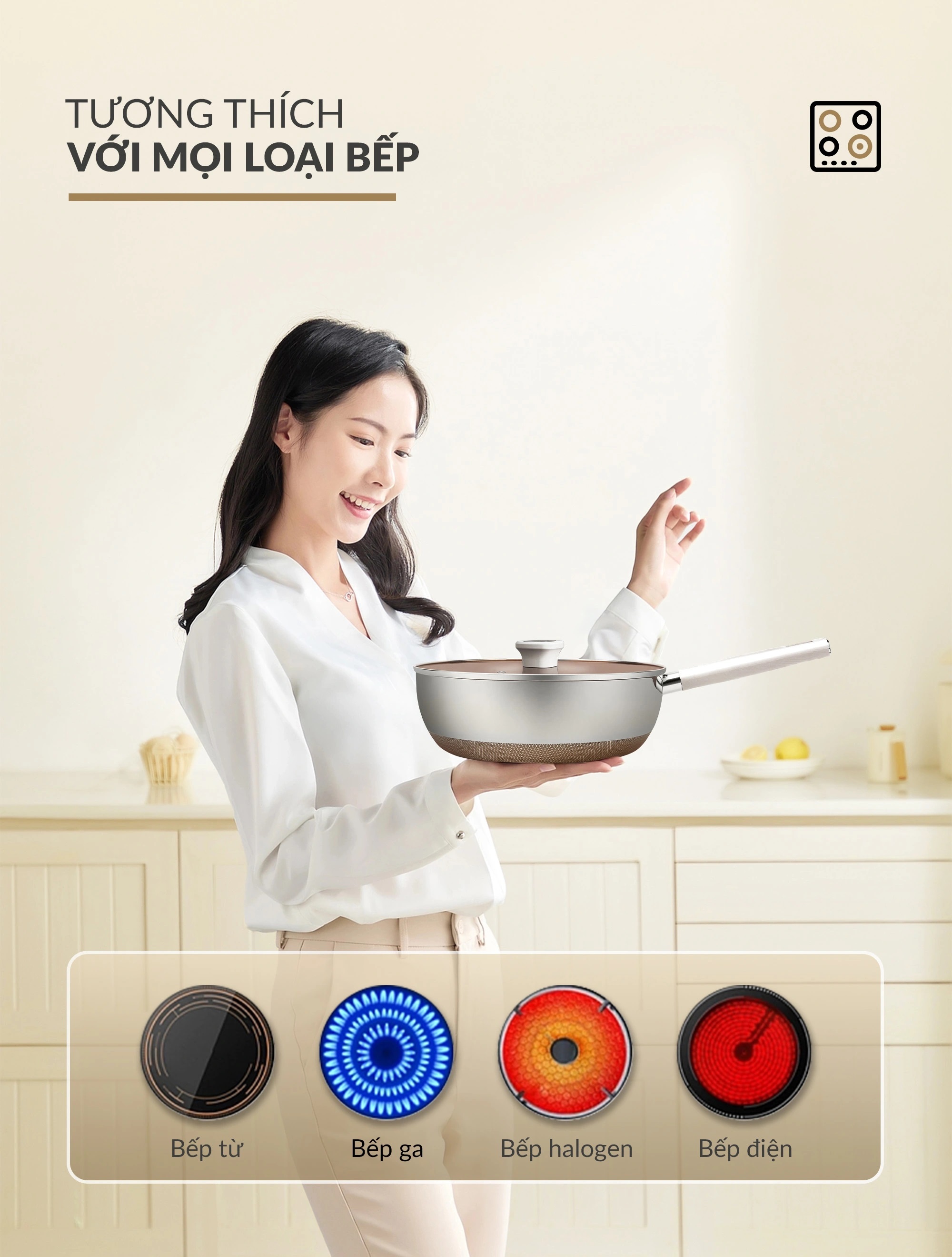 - Dùng cho mọi loại bếp: ga, từ, điện, hồng ngoại