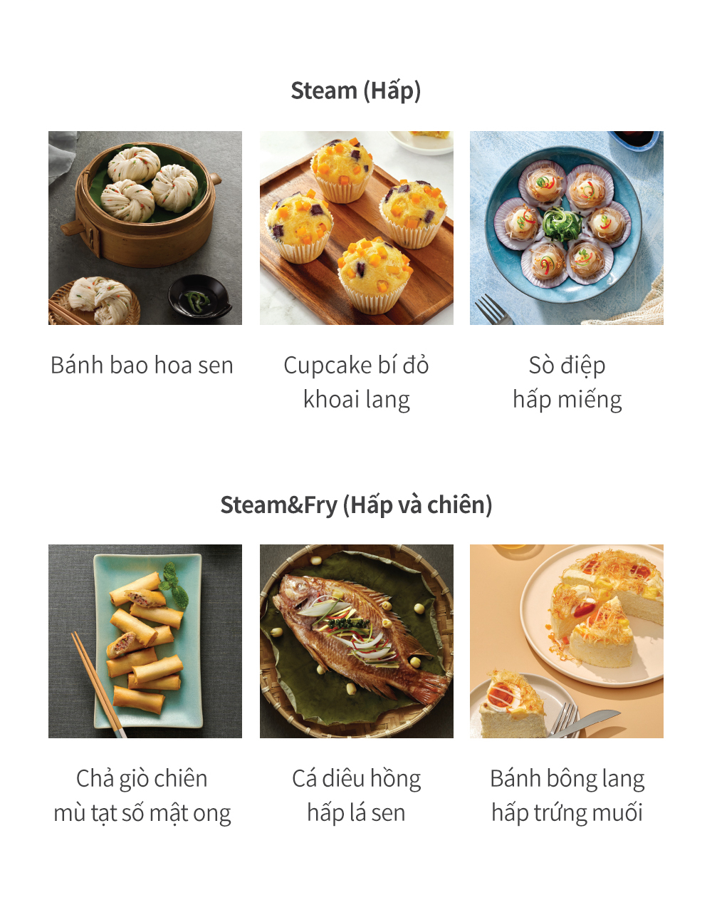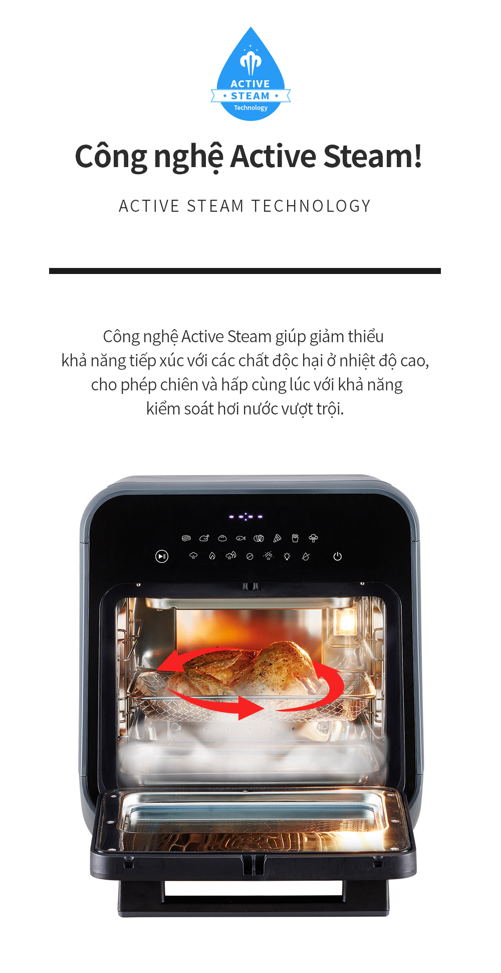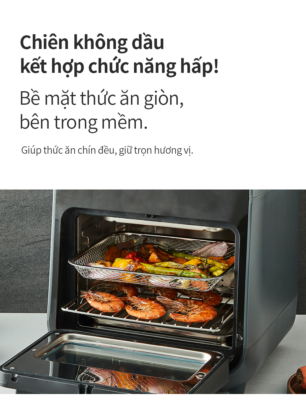 - Chiên không dầu kết hợp chức năng hấp: Bề mặt thức ăn giòn, bên trong mềm và mọng nước cũng như giữ nguyên vẹn thành phần dinh dưỡng của món ăn nhờ chức năng hấp hơi nước.