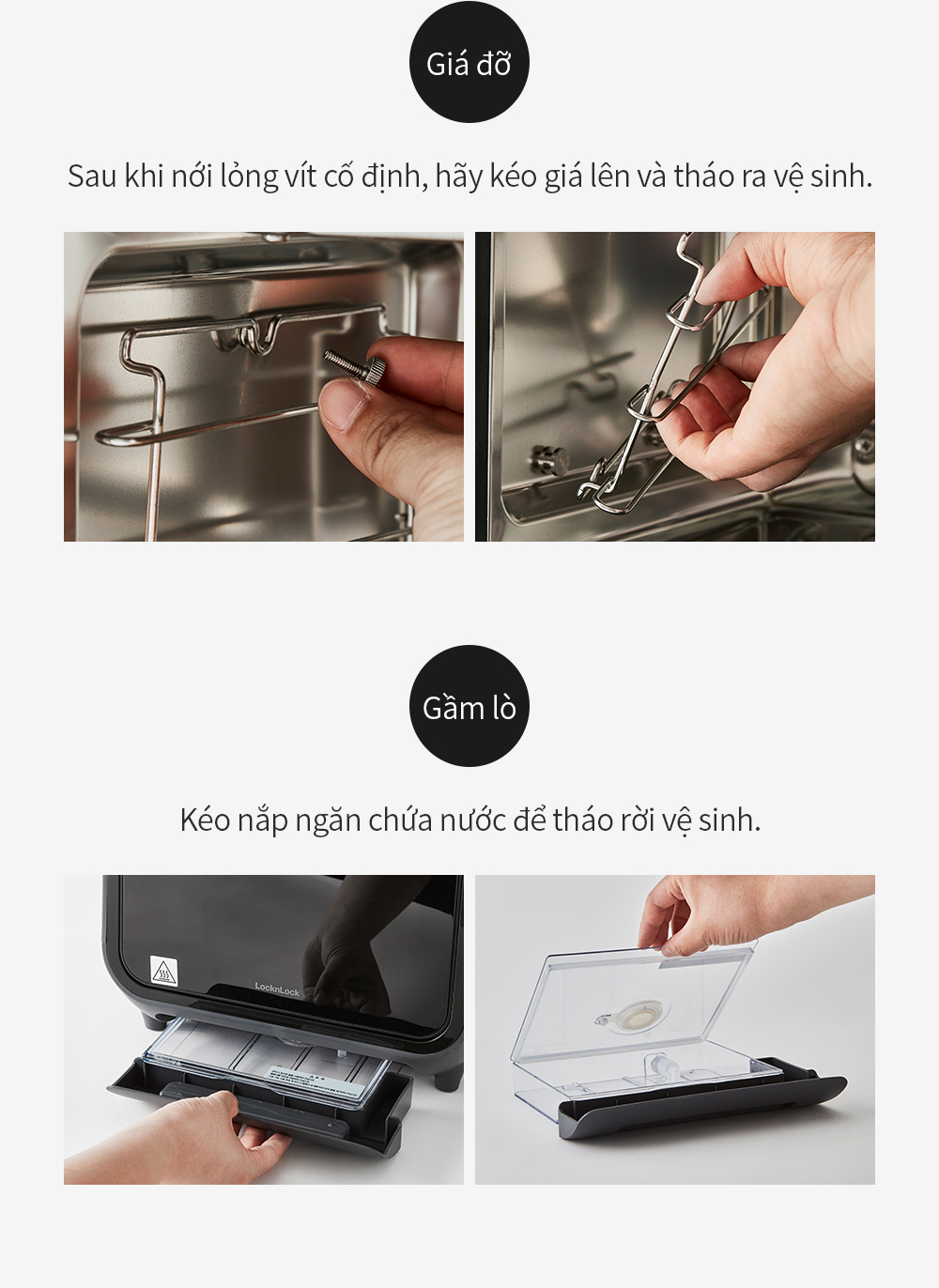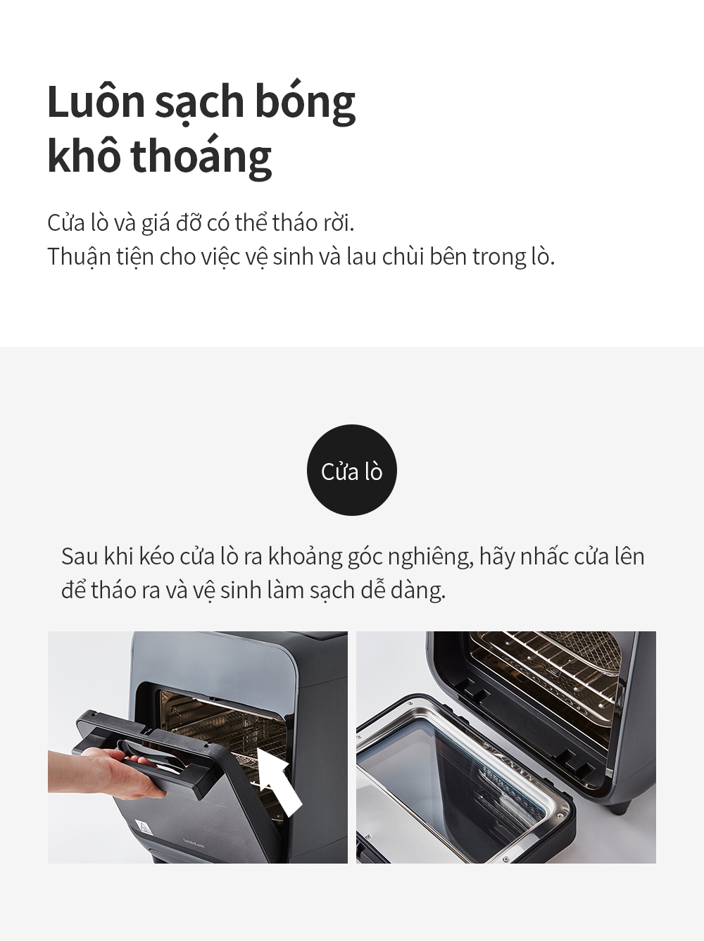 - Cửa lò và giá đỡ có thể tháo rời: Thuận tiện cho việc vệ sinh và lau chùi bên trong lò.