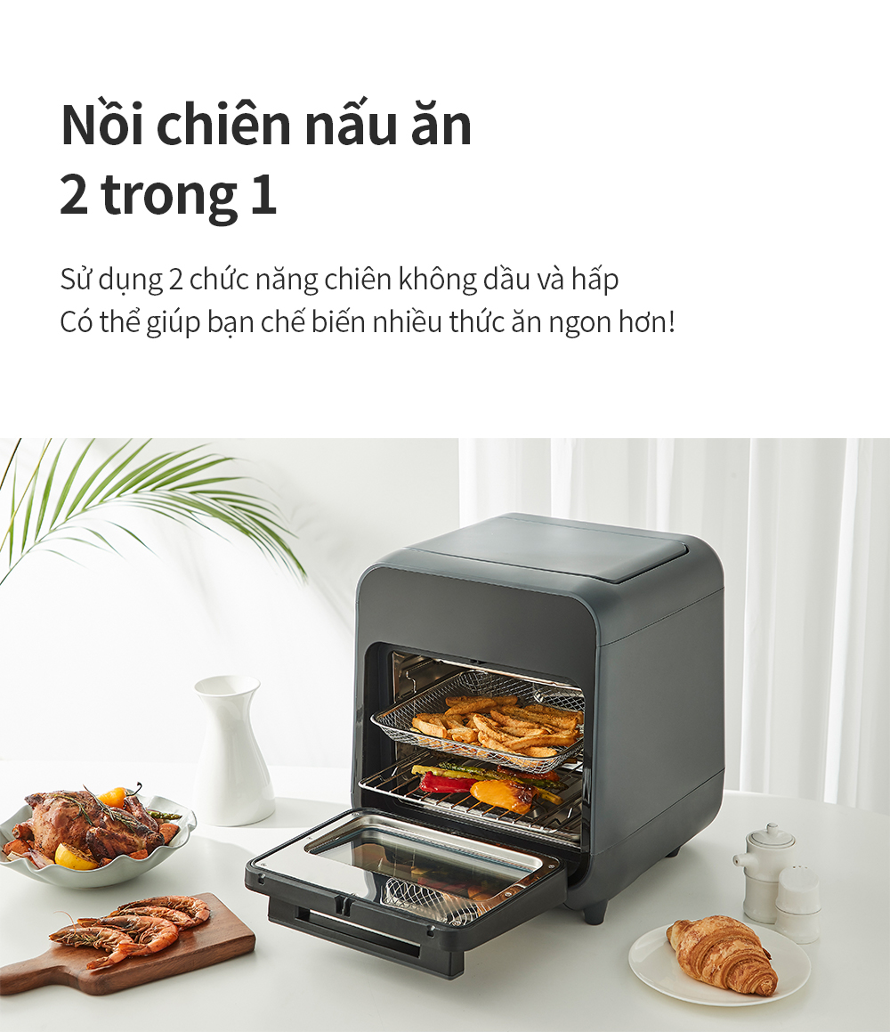✔️ Chiên không dầu kết hợp chức năng hấp: Bề mặt thức ăn giòn, bên trong mềm và mọng nước cũng như giữ nguyên vẹn thành phần dinh dưỡng của món ăn nhờ chức năng hấp hơi nước.