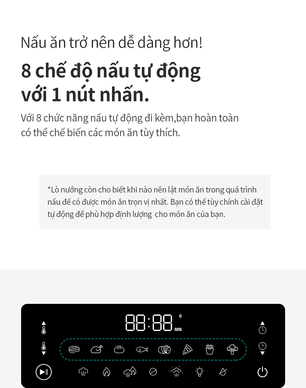 - Với 8 chức năng được cài đặt sẵn như: Thịt heo, Thịt gà, Bánh bao, Cá, Khoai Tây cắt lát, Pizza, Khoai Tây cọng, Rau củ… giúp các chị em nội trợ dễ dàng chế biến nhiều loại thức ăn