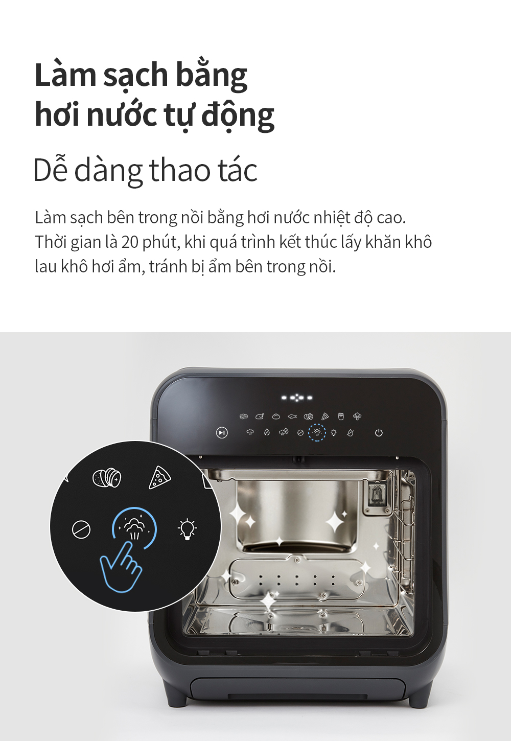 - Làm sạch bằng hơi nước: Sử dụng hơi nước ở nhiệt độ cao để khử trùng bên trong. Dễ dàng vệ sinh khoang nấu bên trong.