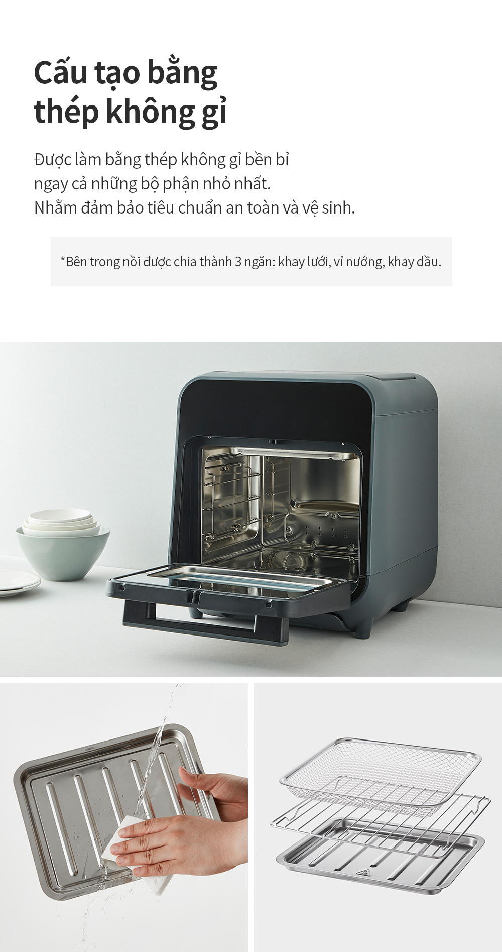 ✔️ Khoang nướng, các phụ kiện đi kèm tiếp xúc với thức phẩm đều bằng inox 304