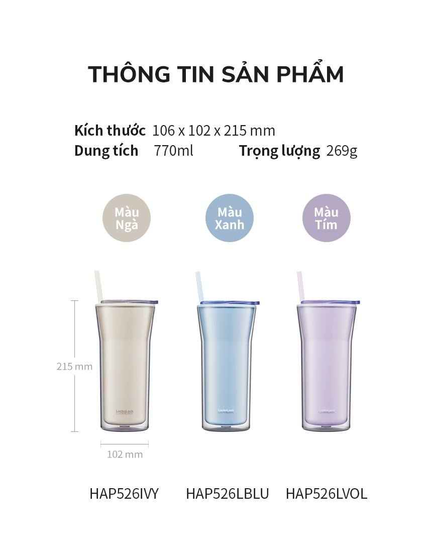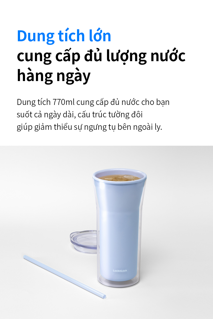 - DUNG TÍCH CỐC LỚN ĐỦ ĐỂ CUNG CẤP LƯỢNG NƯỚC HÀNG NGÀY: Dung tích 770ml cung cấp đủ nước cho bạn suốt cả ngày dài, cấu trúc tường đôi giúp giảm thiểu sự ngưng tụ bên ngoài ly.