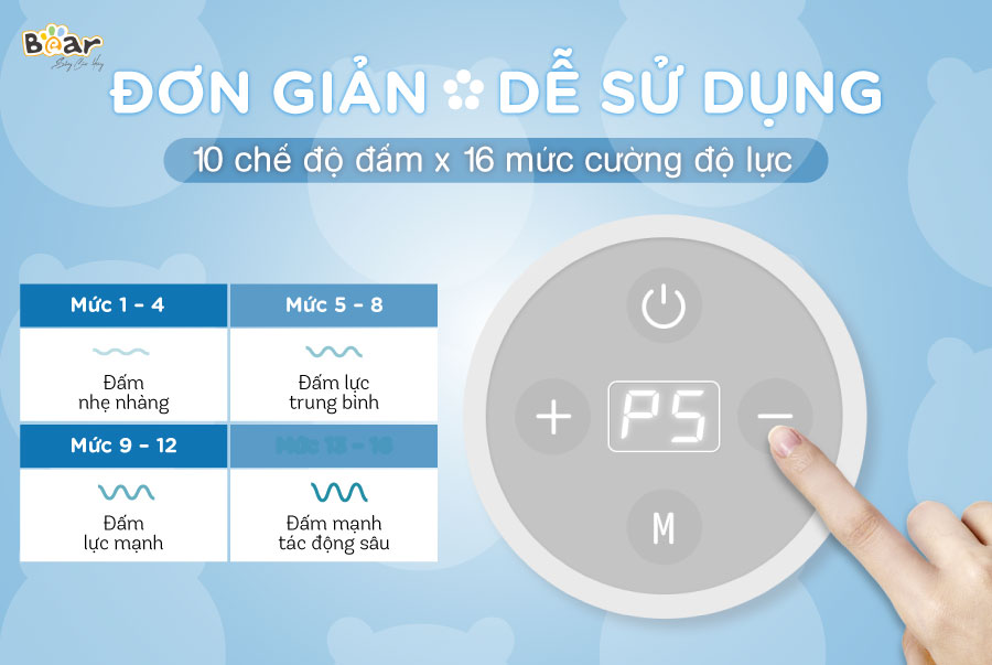 Sở hữu thiết kế thông minh, kiểu dáng gọn nhẹ kết hợp với 16 cường độ đấm bóp nhanh, chậm, máy đấm lưng Bear AMQ-A01X1 (MA- B01V1) mô phỏng chân thật phương pháp đấm massage như tay người, giúp bạn thư giãn vùng cổ, vai gáy, thắt lưng, và đùi một cách hiệu quả. Bạn muón massage ở mọilúc, mọi nơi.