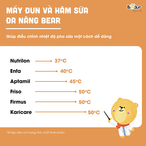 - Máy đun và hâm sữa đa năng Bear giúp điều chỉnh nhiệt độ pha sữa một cách dễ dàng. Duy trì nhiệt độ của nước lên đến 72 giờ để luôn sẵn sàng pha sữa cho bé