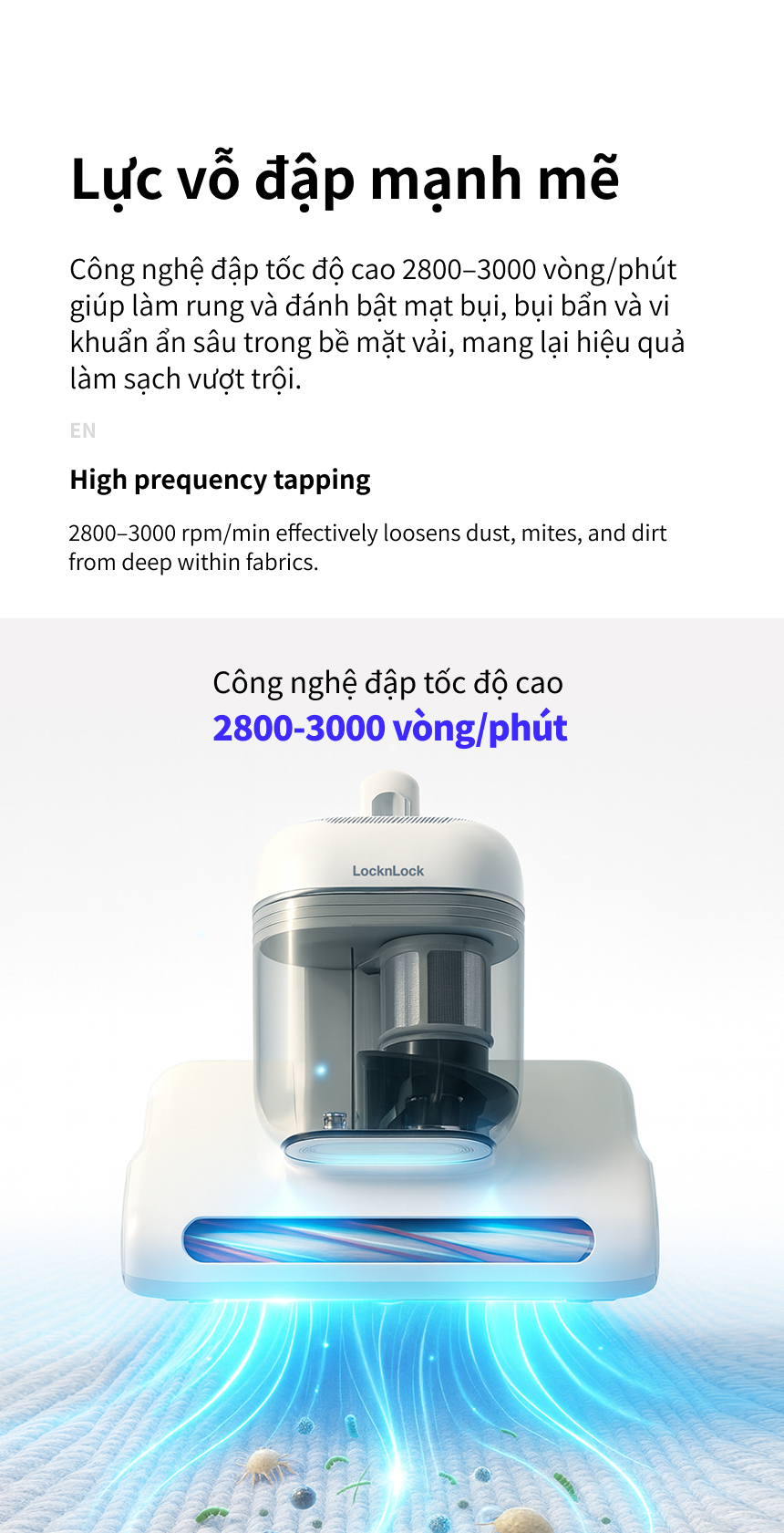 ✦ LỰC VỖ ĐẬP MẠNH MẼ: Công nghệ đập tốc độ cao 2800–3000 vòng/phút giúp làm rung và đánh bật mạt bụi, bụi bẩn và vi khuẩn ẩn sâu trong bề mặt vải, mang lại hiệu quả làm sạch vượt trội.