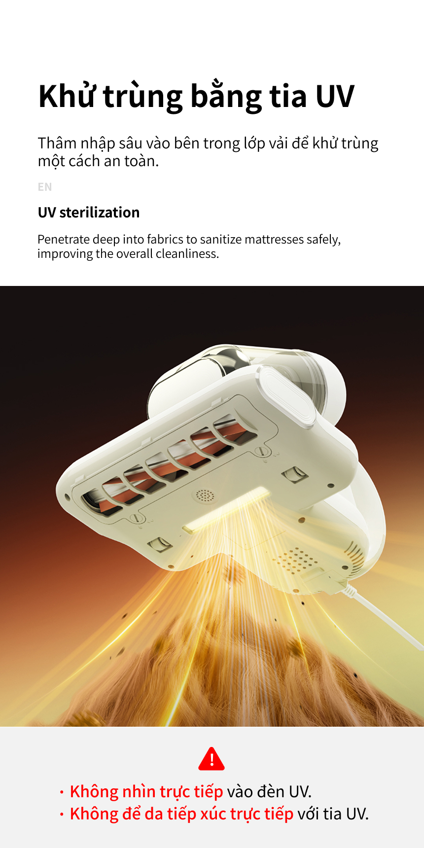 ✦ KHỬ TRÙNG BẰNG TIA UV: Thâm nhập sâu vào bên trong lớp vải để khử trùng một cách an toàn.