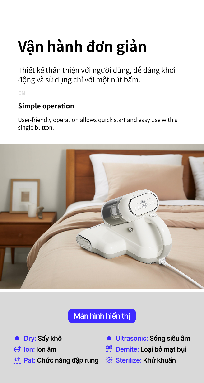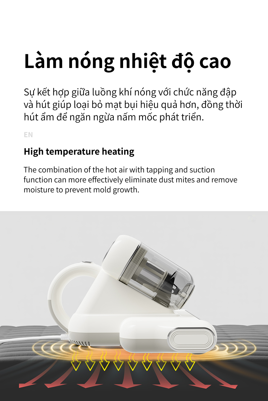✦ LÀM NÓNG NHIỆT ĐỘ CAO: Sự kết hợp giữa luồng khí nóng với chức năng đập và hút giúp loại bỏ mạt bụi hiệu quả hơn, đồng thời hút ẩm để ngăn ngừa nấm mốc phát triển.