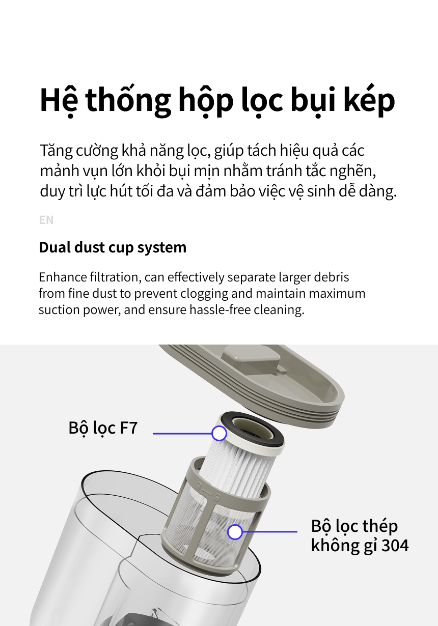 ✦ HỆ THỐNG HỘP LỌC BỤI KÉP: Tăng cường khả năng lọc, giúp tách hiệu quả các mảnh vụn lớn khỏi bụi mịn nhằm tránh tắc nghẽn, duy trì lực hút tối đa và đảm bảo việc vệ sinh dễ dàng.