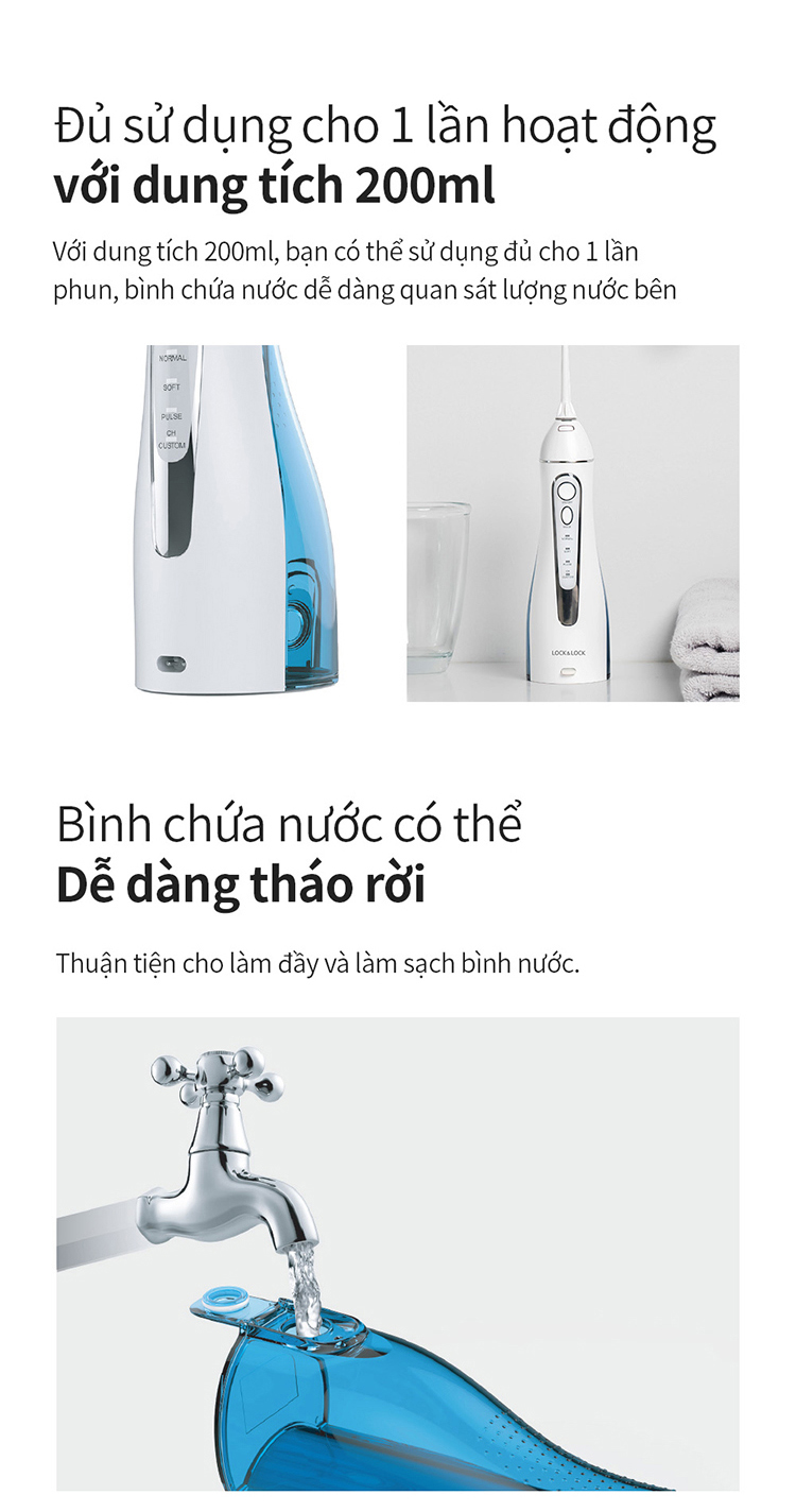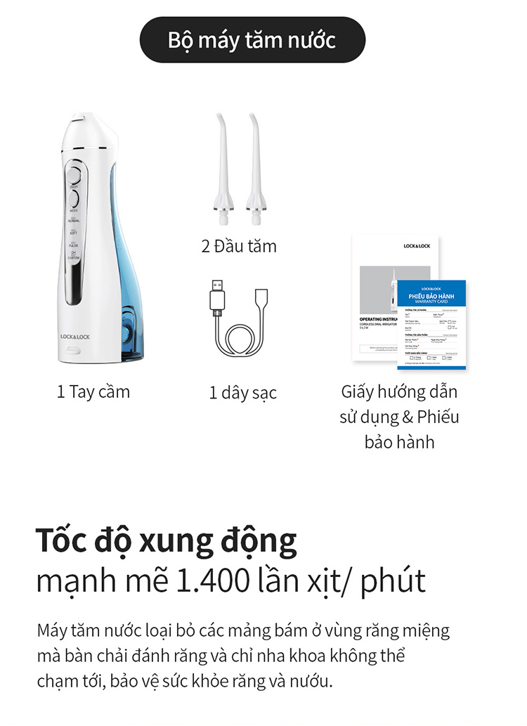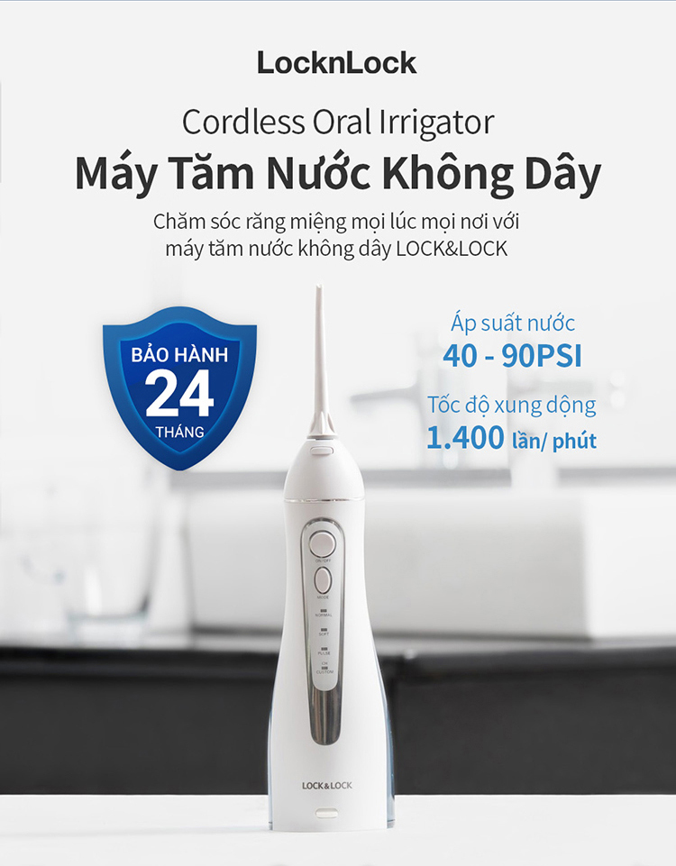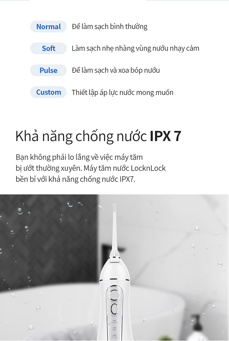 - Máy Tăm Nước Không Dây Lock&Lock Cordless Oral Irrigator ENR156BLU gồm 4 chế độ hoạt động: Đáp ứng các nhu cầu chăm sóc răng miệng khác nhau.