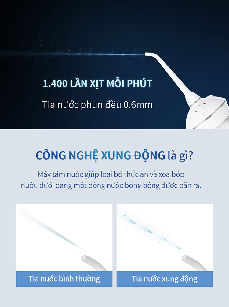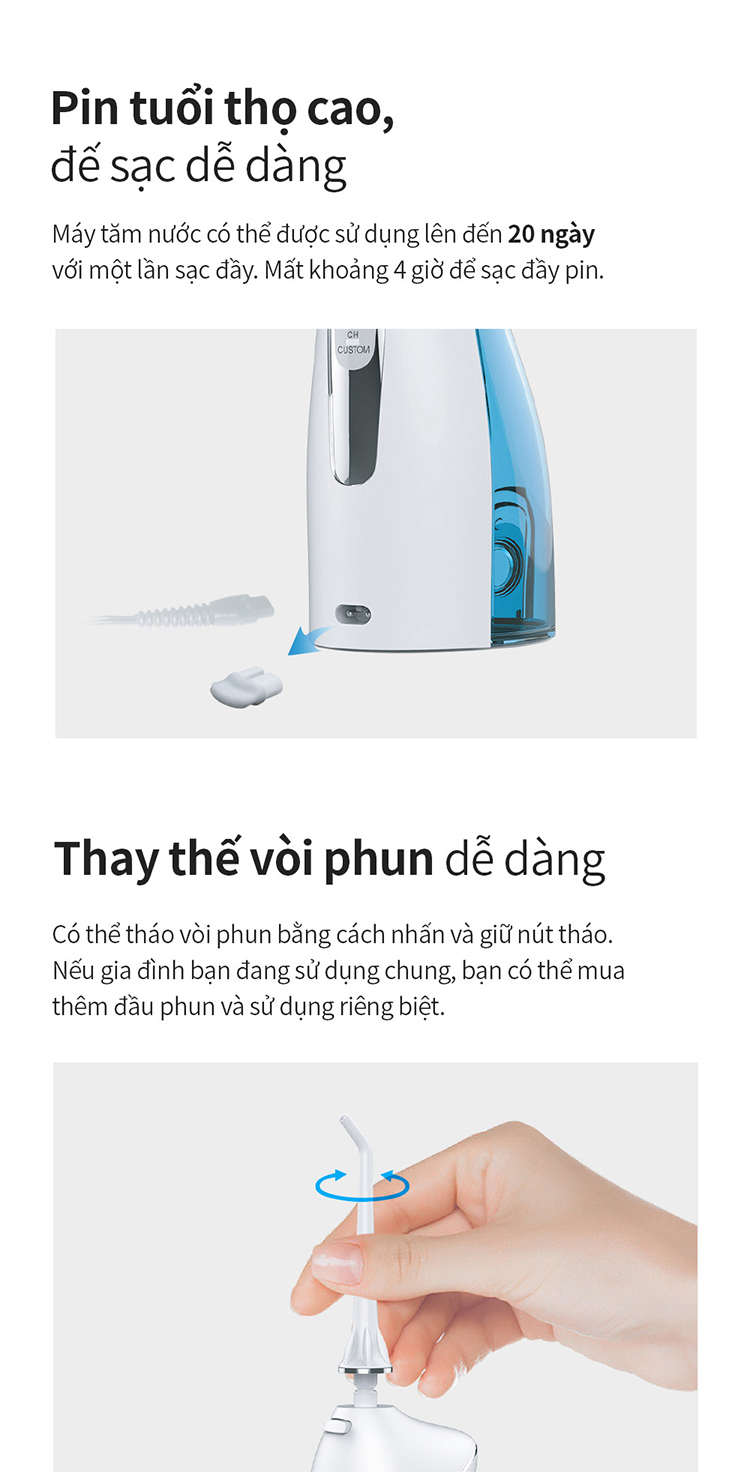 - Đầu tăm xoay 360 °: Làm sạch răng miệng theo nhiều hướng.