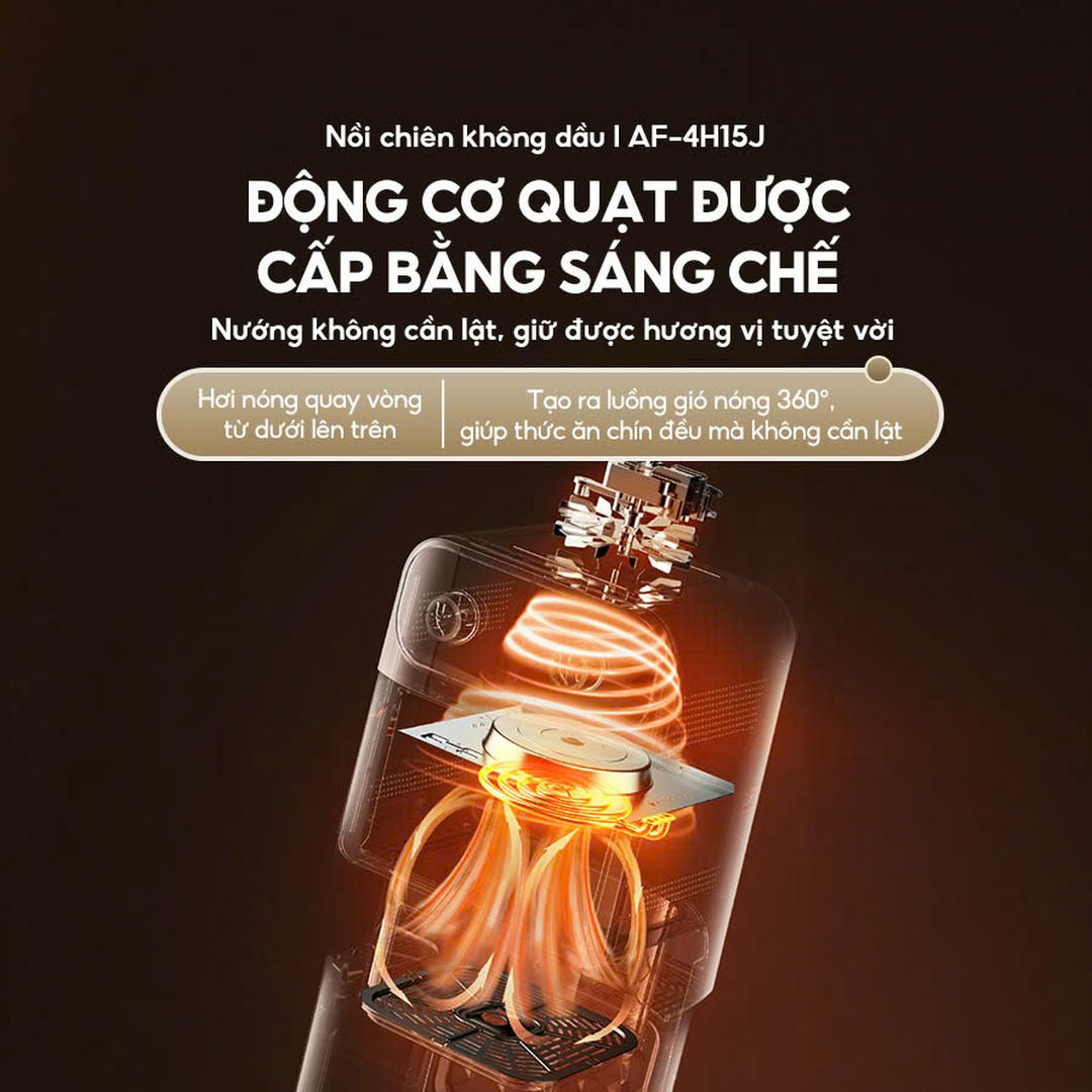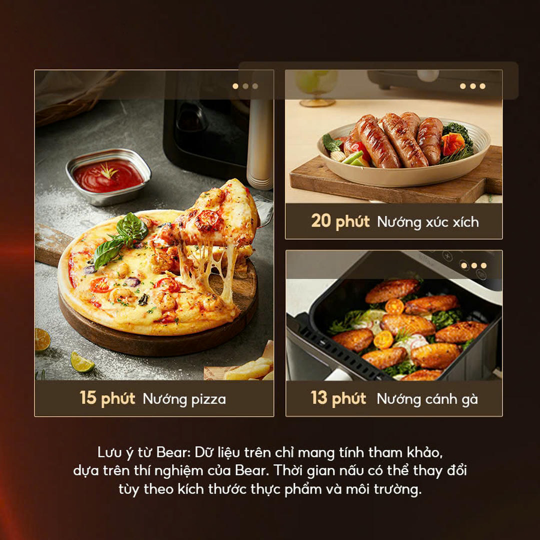 - Bear nâng cấp động cơ quạt tuần hoàn, hơi nóng quay vòng từ dưới lên trên tạo ra luồng gió nóng 360°. Bạn chiên nướng không cần lật, món ăn chín đều giữ được hương vị tuyệt vời.