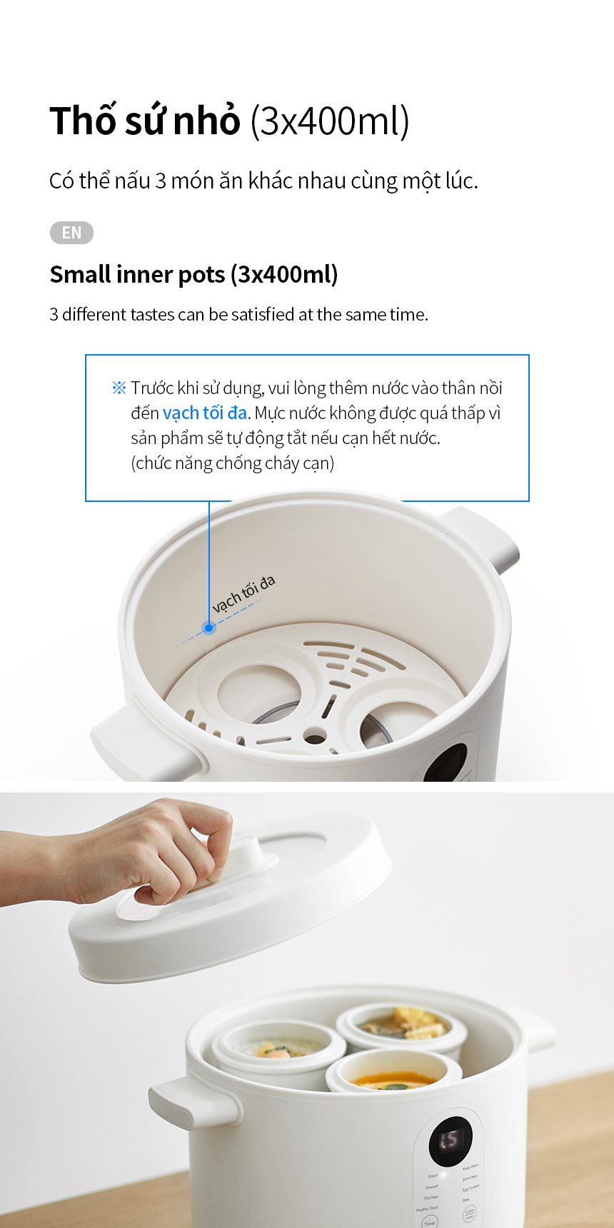♦ Ba thố sứ nhỏ, mỗi thố dung tích 400ml: Có thể nấu 3 món ăn khác nhau cùng một lúc