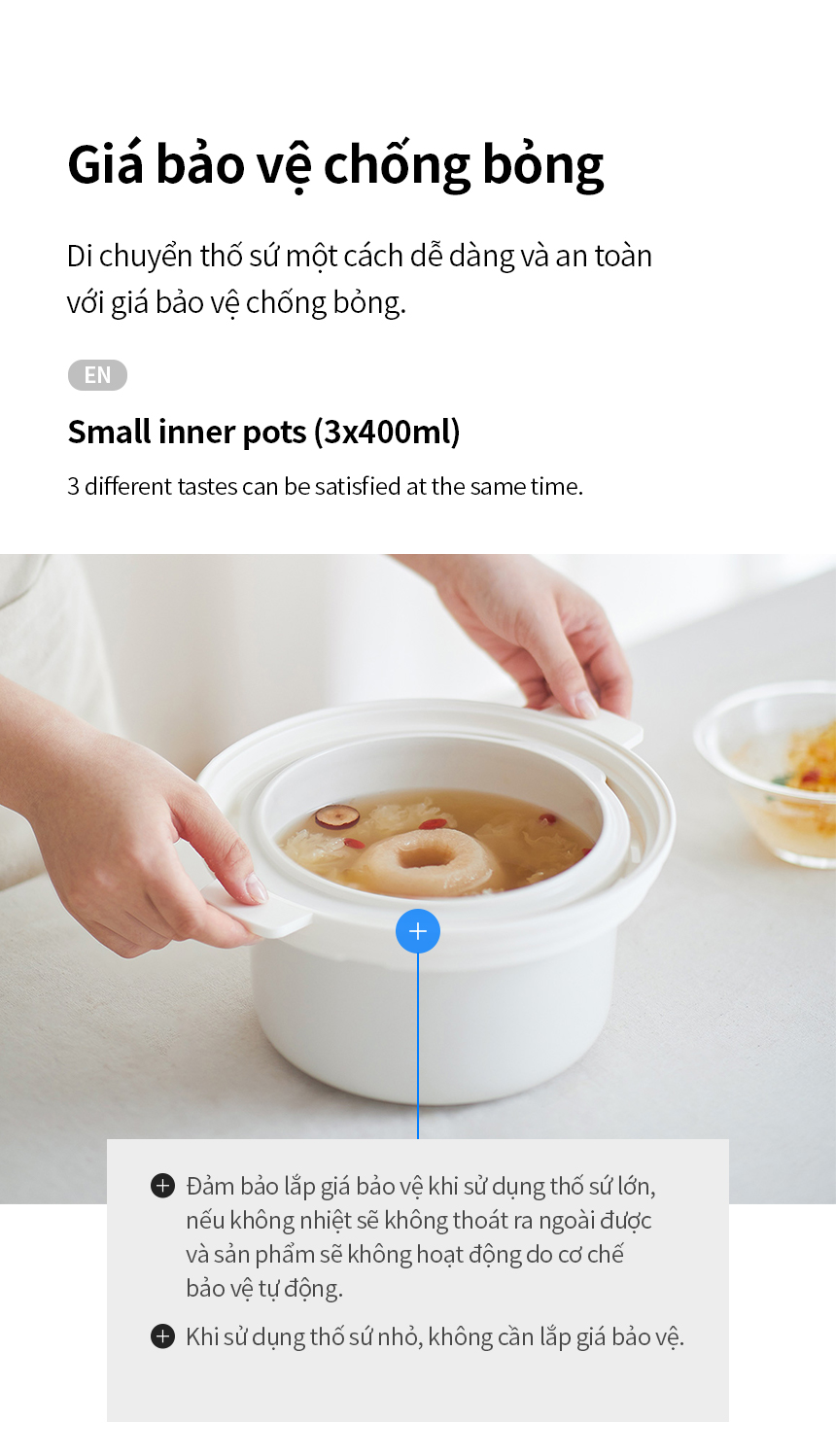 - Vui lòng lắp giá bảo vệ khi sử dụng thố sứ lớn, nếu không nhiệt sẽ không thể thoát ra ngoài và sản phẩm sẽ không hoạt động do cơ chế bảo vệ tự động.