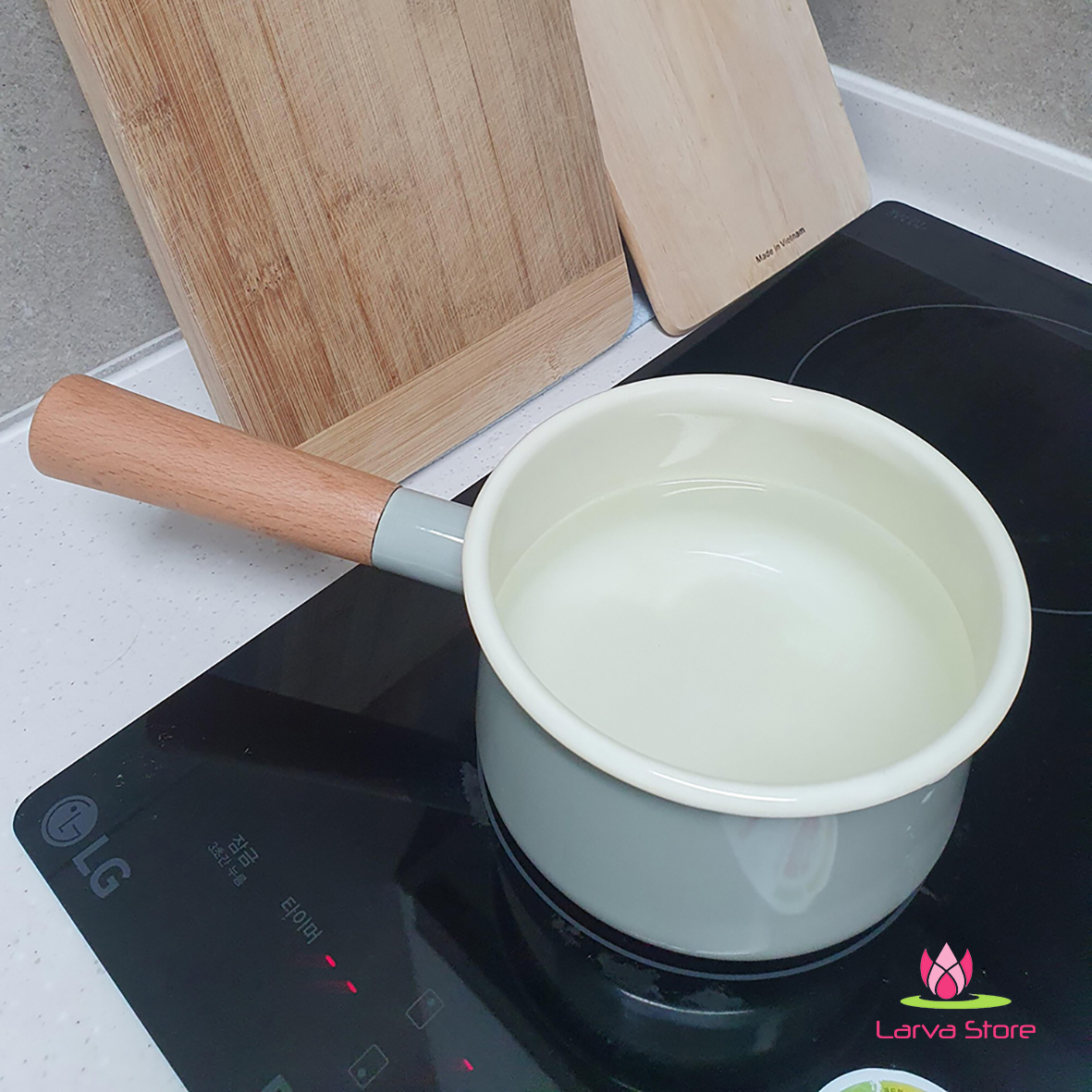 ✔️ Chất liệu: thép không gỉ phủ men sứ chống dính (lớp men sứ công nghệ mới là lớp men sứ thủy tinh, tăng độ bền bỉ lâu dài và an toàn trong nấu nướng), quai gỗ