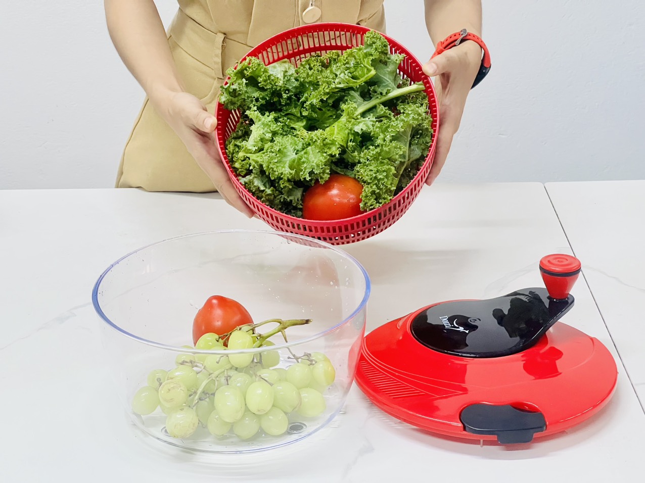 - Với lực xoay cực nhẹ mà tốc độ xoay rất mạnh rổ không chỉ có tác dụng quay li tâm làm kiệt nước thực phẩm mà khi cần rửa các loại hoa quả nhỏ, khó rửa như táo, nho, các c cho vào quay luôn ạ. Lực quay của nước sẽ làm sạch hoa quả rất hiệu quả.